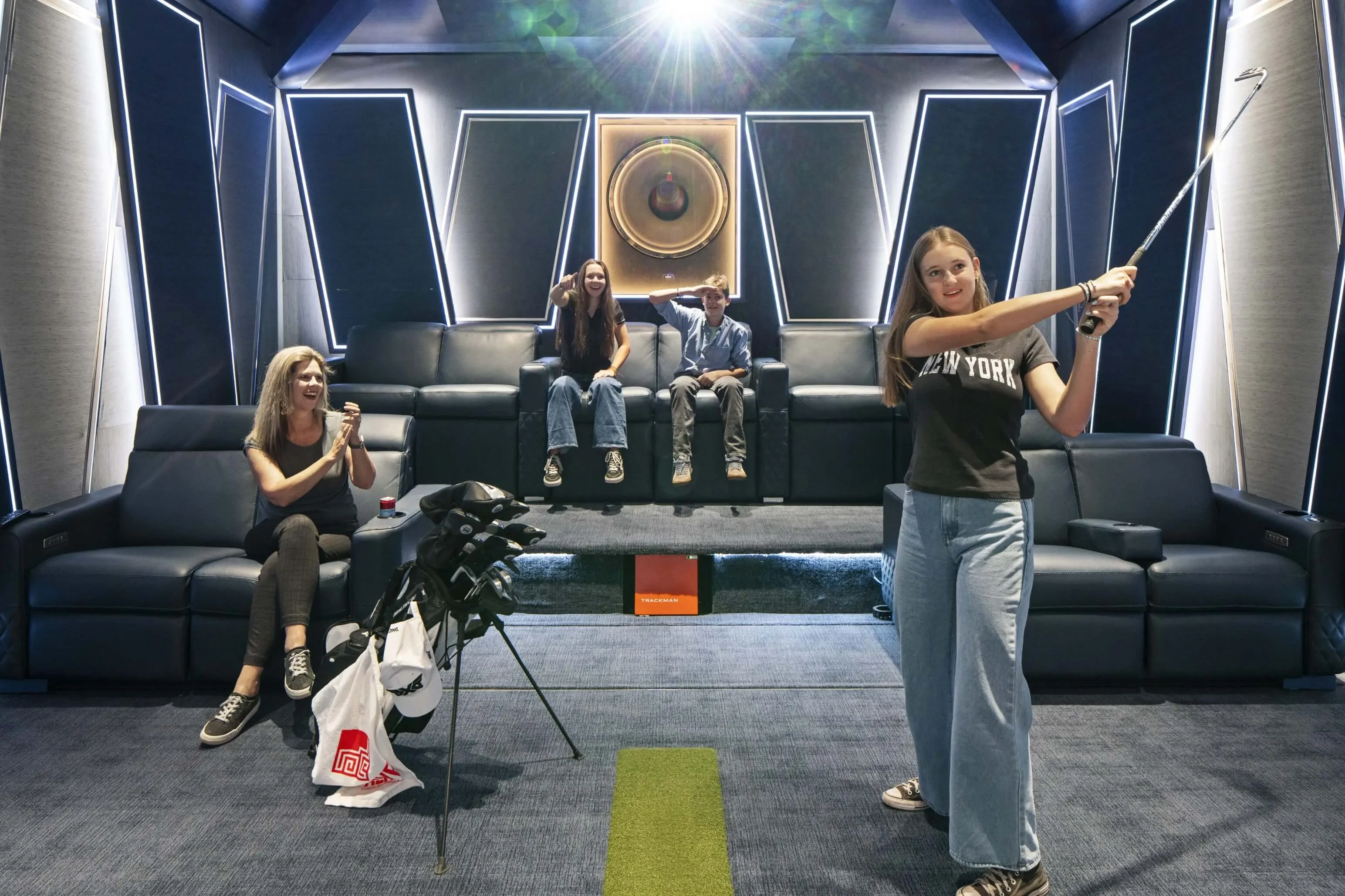 In a dual-use cinema and simulator environment where real golf balls are driven into a retractable impact screen, tactile, controlled low-frequency response is essential. The ASCENDO system provides both visceral impact and precision. When it’s time to watch a movie, the 32-inch infrasub delivers bass energy the audience can feel, while the ASCENDO 18-inchers around the room pick up where the infrasub leaves off, handling the more ‘standard’ low frequencies with finesse.